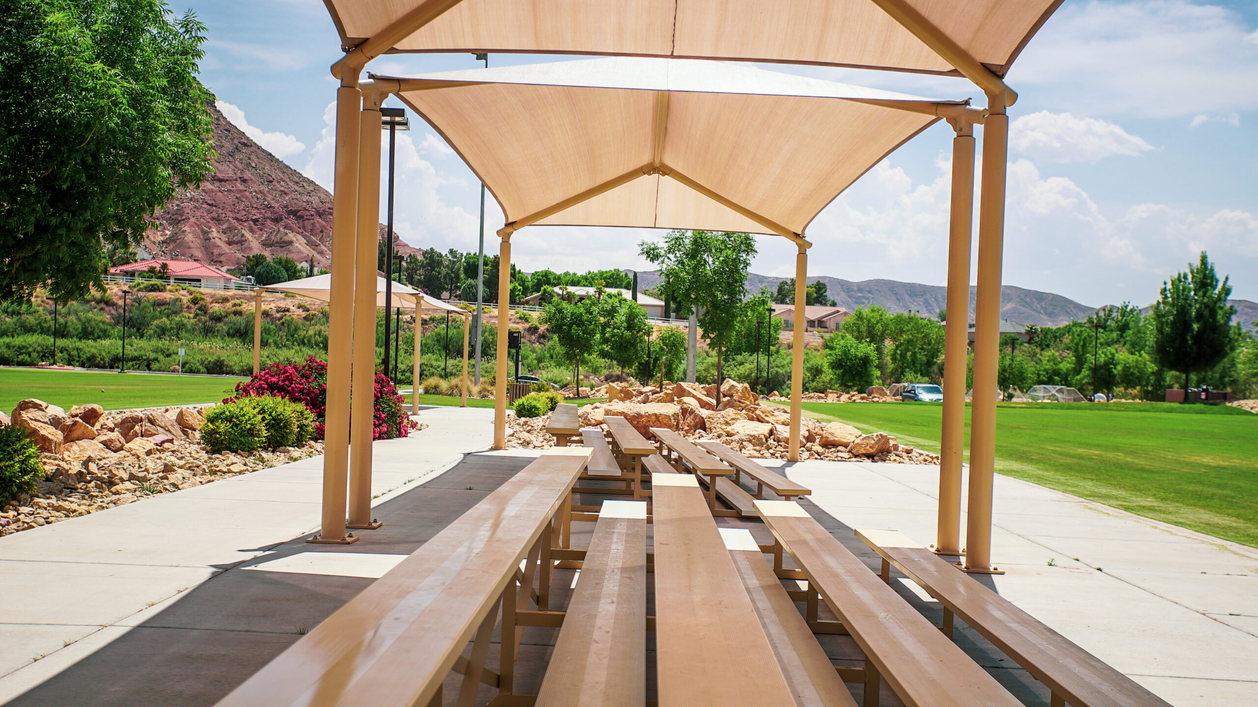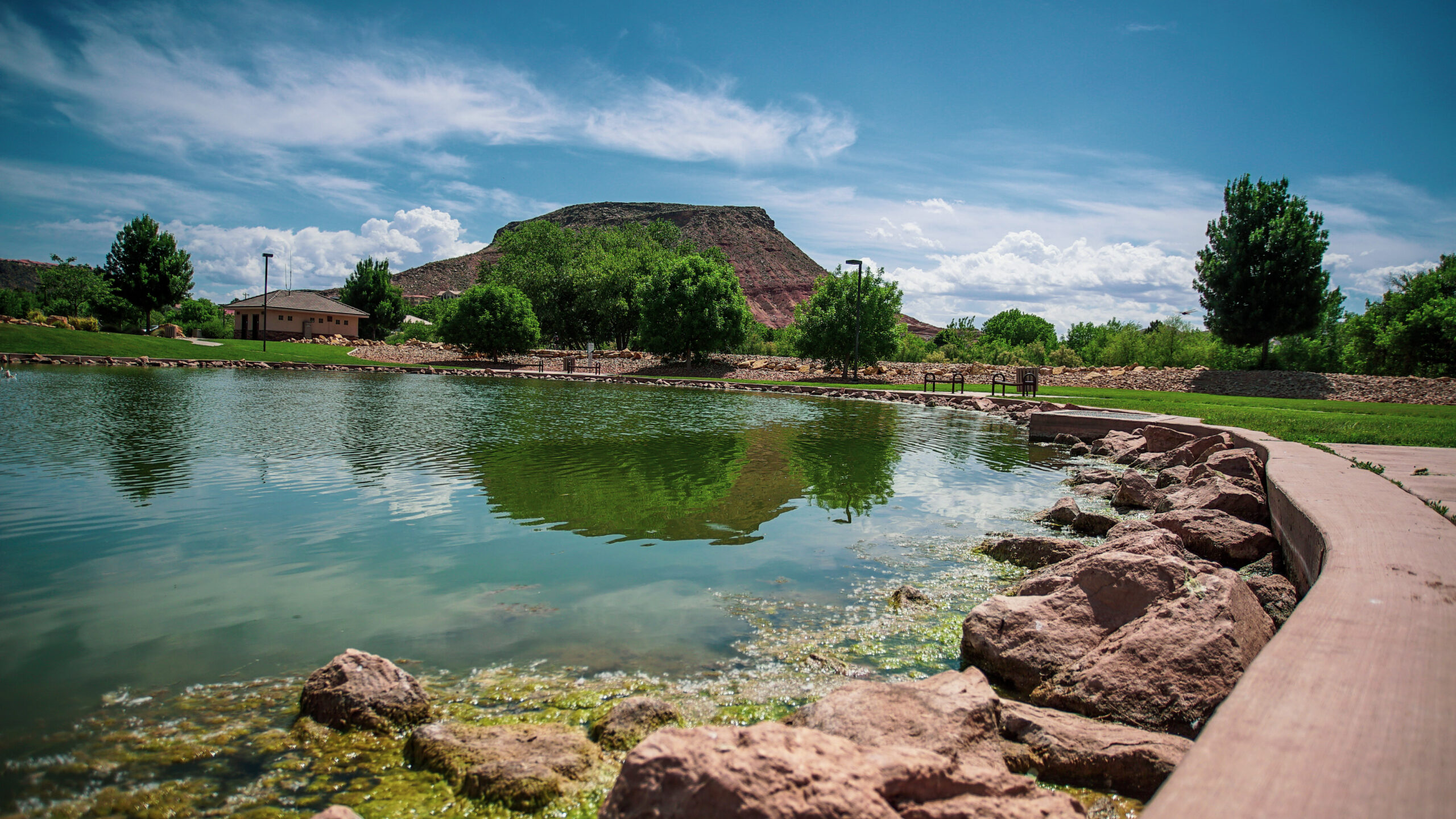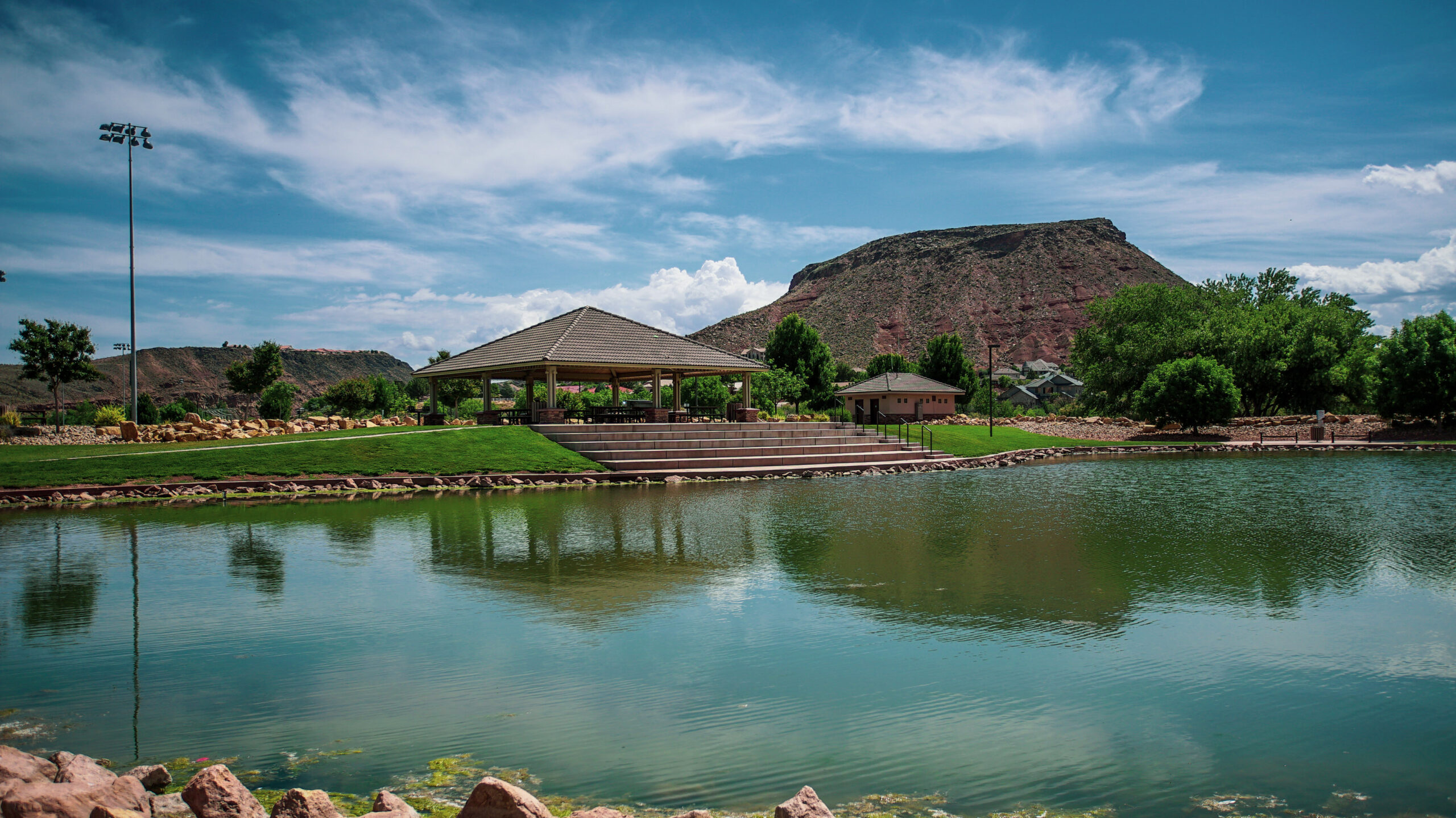 With four full-size soccer fields, this park packs some multi-use features that go beyond the typical. Amphitheater-style steps from the pavilion to the fishery pond. The Urban Fishery Pond is stocked with trout by the UDWR (Utah Division of Wildlife Resources) every 3 weeks from October through April. A fishing license is needed for ages 12 yrs and up. Under the age of 12 yrs needs a licensed adult present. The park connects to the Virgin River Trail. Access to the Virgin River is also available. This park is fully equipped with restroom facilities and drinking fountains.